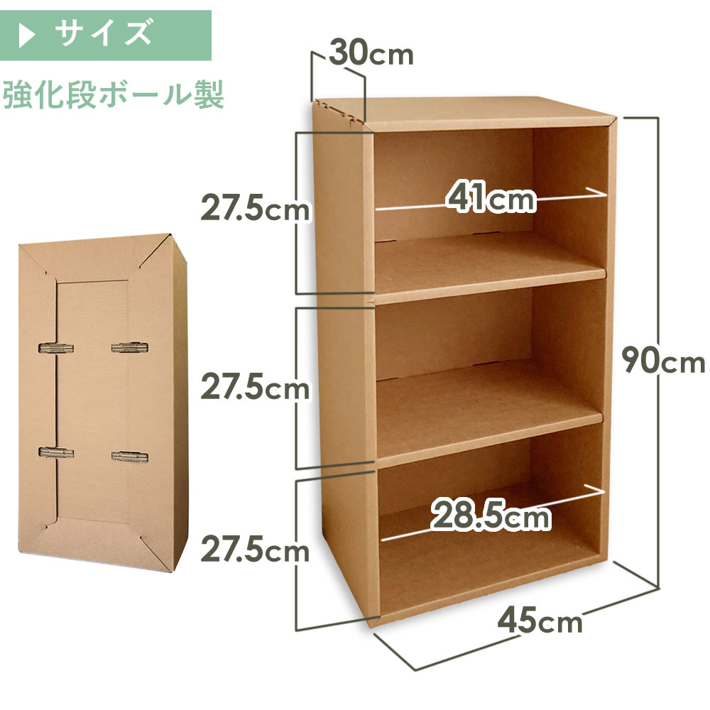 通常のダンボールより色味の濃い強化ダンボールを使用しているので、木製家具とマッチしお部屋のイメージを壊しません。 素材はナチュラルで落ち着いた風合いなのでどんなイメージにも合います。 本棚としてお使い頂くことも出来ます。重い辞書をぎっしり入れてもびくともしない驚きの強度で、大切な書籍をきっちり収納。特殊な設計で長期間保管しても壊れることはありません。
